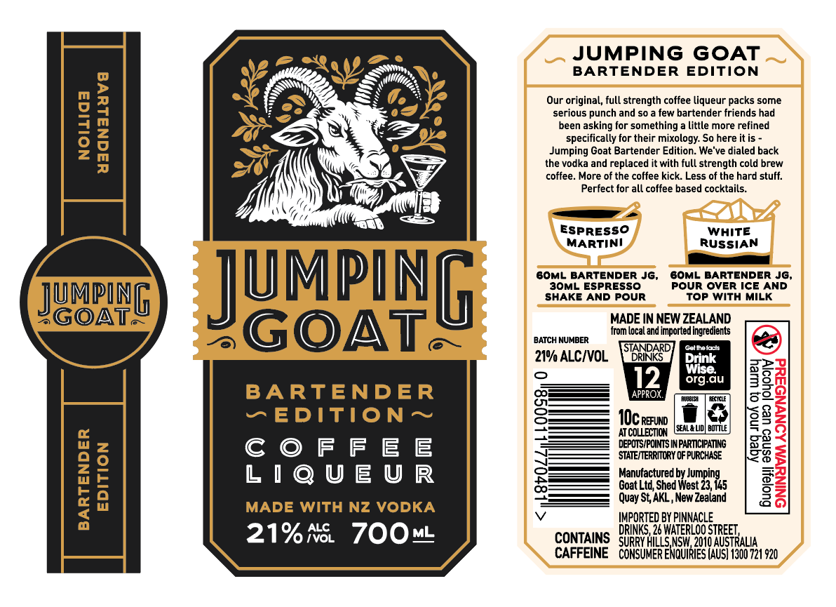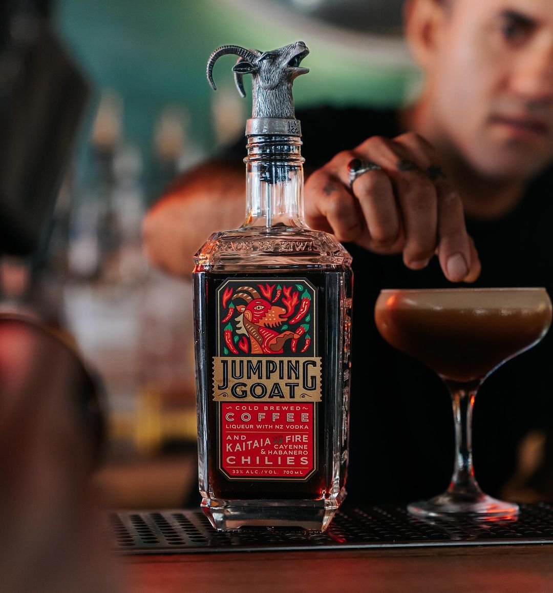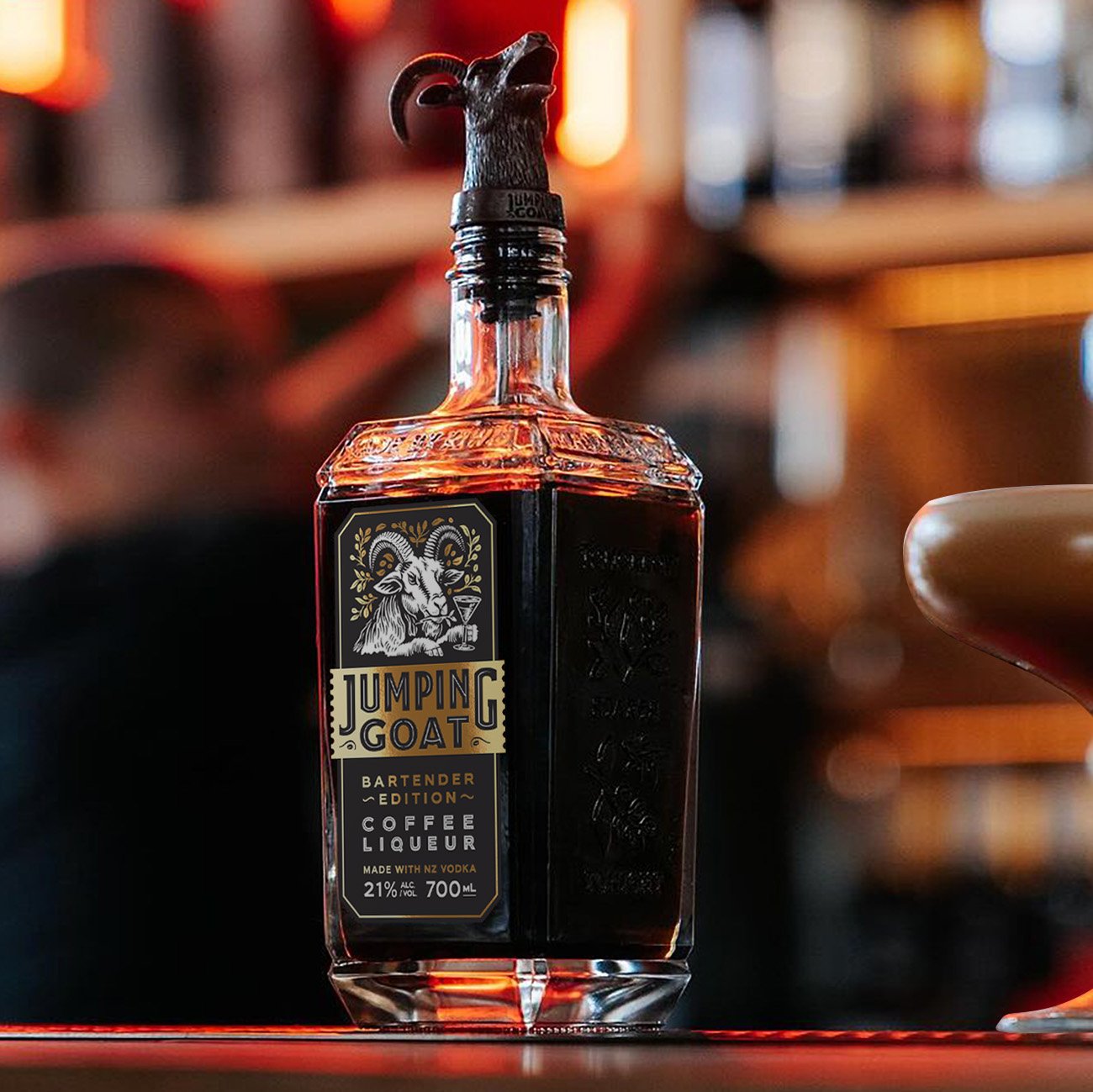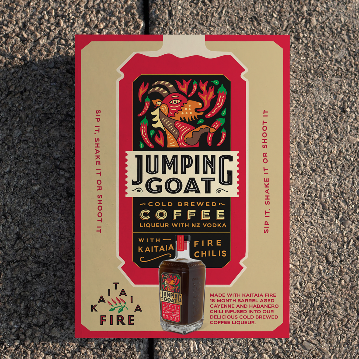 Jumping Goat is a cold brewed coffee liqueur inspired by the origin story of coffee, where a goat herd watched his flock eat coffee berries and jump into the night before boiling some himself. I’ve worked from start up stage and supplied naming and brand identity, a bespoke bottle shape, brand comms and apparel.